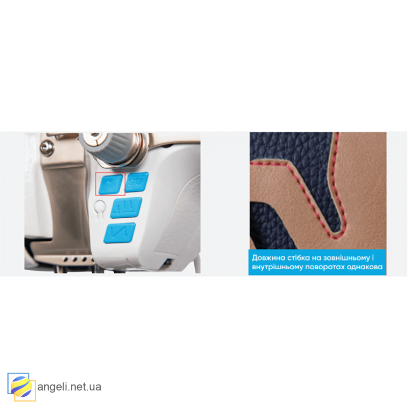- Автоматичні функції: підйом ролика, закріпка, обрізка нитки, шпуленамотувач