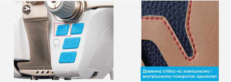 Механізм зворотного шиття керується кроковим двигуном. Він працює майже безшумно, а робочий процес проходить швидше та більш комфортно для оператора.
