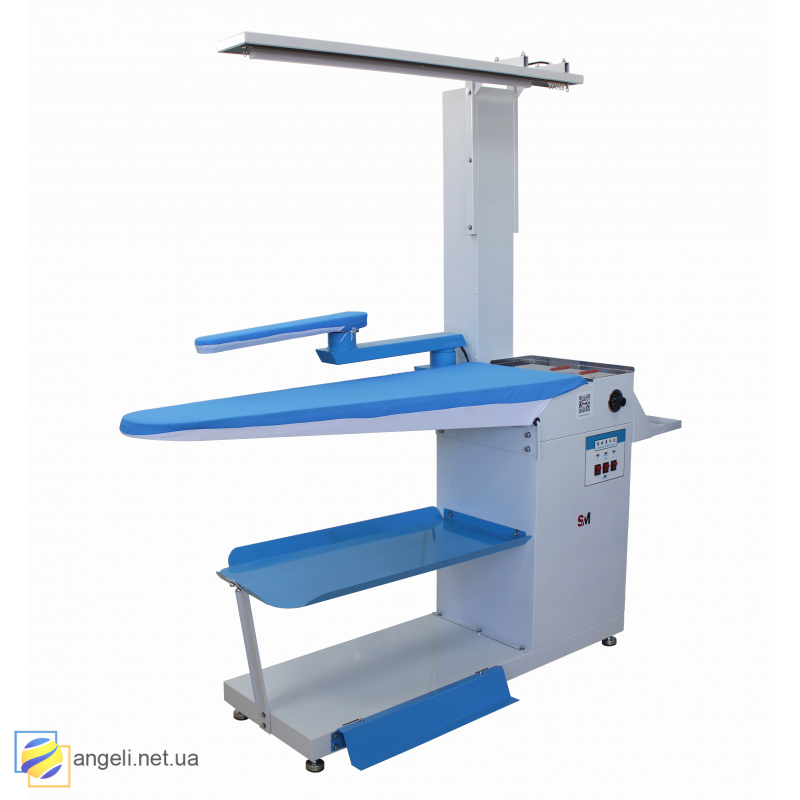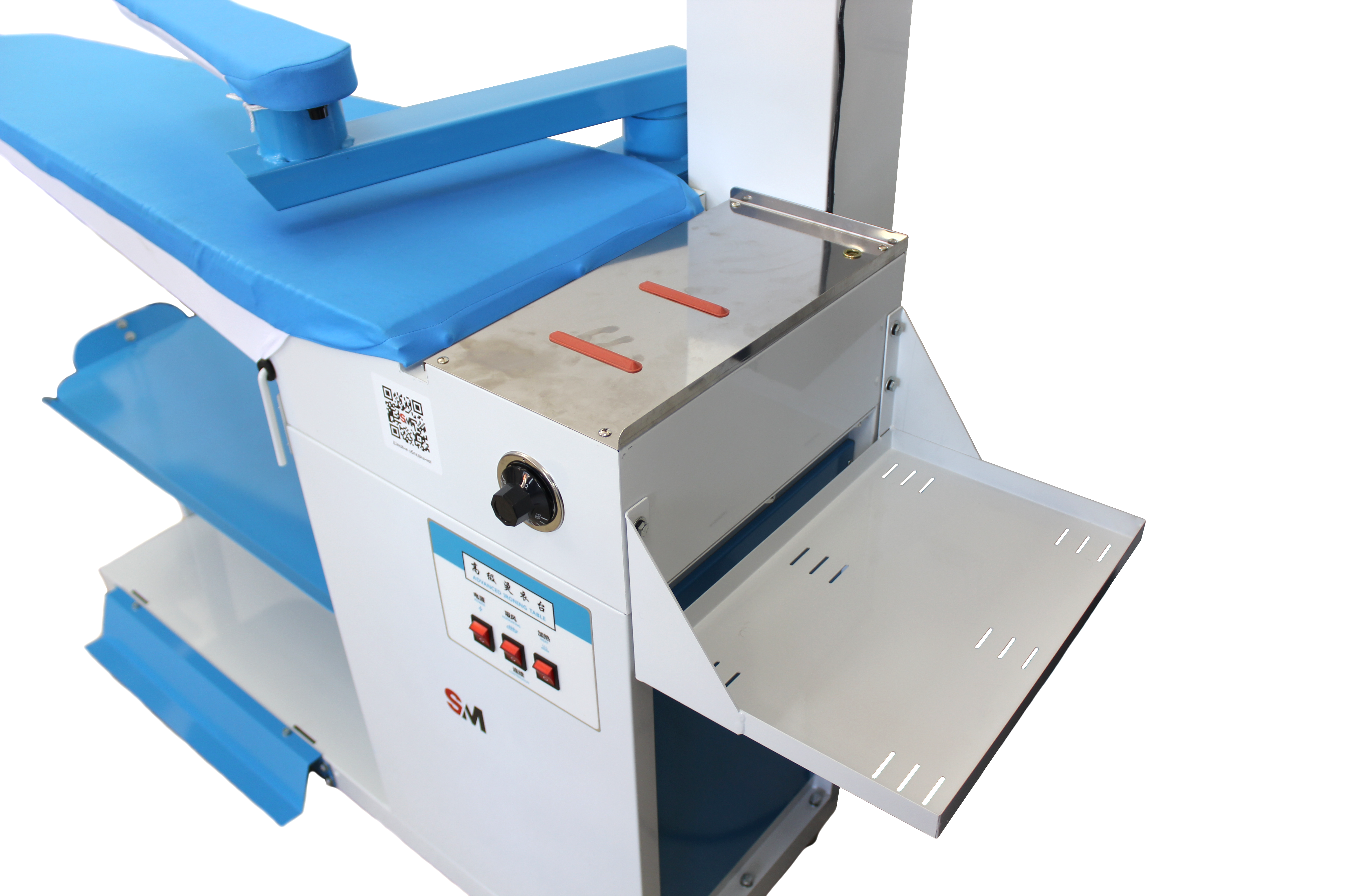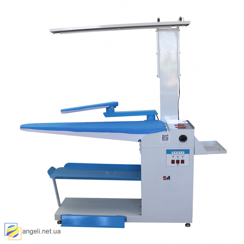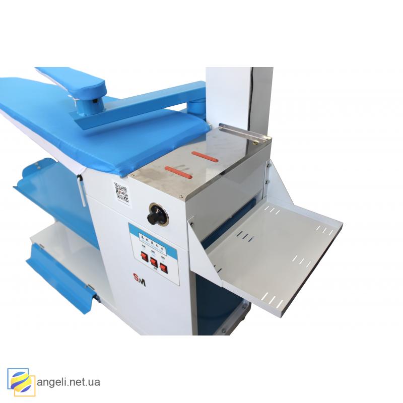 Промисловий прасувальний стіл SM ST-Q3 оснащений зручною підставкою для праски та парогенератора, що підвищує комфорт і безпеку роботи.