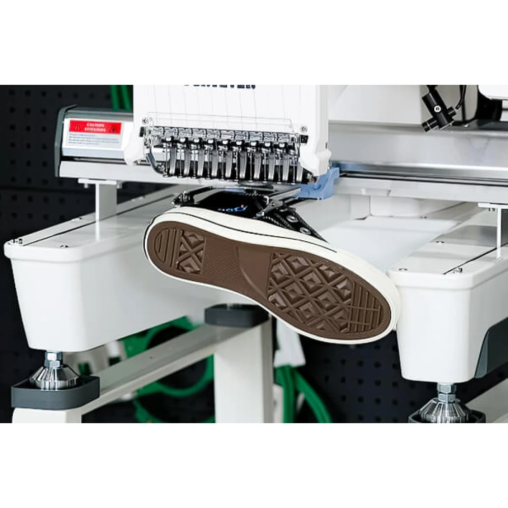 За потреби FORTEVER Halo-X може доукомплектовуватися спеціальним універсальним затискачем для взуття, що розширює можливості машини у роботі з готовими виробами. Така оснастка забезпечує надійну фіксацію взуття різних типів і форм, дозволяючи стабільно виконувати вишивку навіть на нерівних поверхнях і складних конструктивних елементах. Це гарантує високу точність позиціонування та стабільну якість вишивки на всьому виробі.