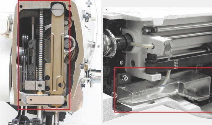 Подача тканини, рух голки та ножа для прорізання петлі контролюються вбудованим кроковим двигуном, що робить процес шиття більш точним та тихим. Двигун споживає на 71% менше електроенергії у порівнянні з фрикційними аналогами.